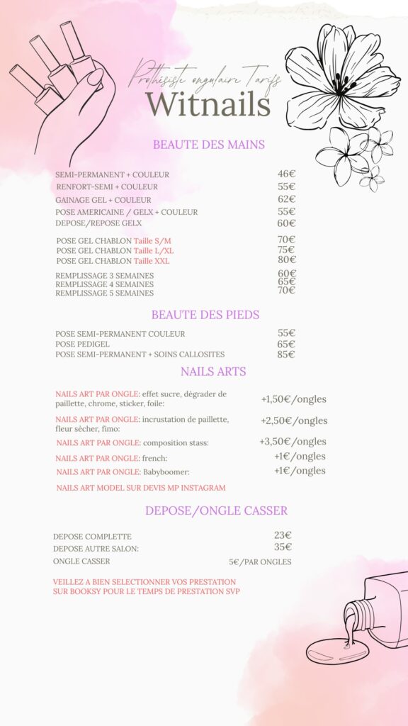 Publié sur Whynot 23711/11/2024Trustindex vérifie que la source originale de l'avis est Google. Bon accueil, souriante et sympathique.Publié sur Nathalie T.24/08/2024Trustindex vérifie que la source originale de l'avis est Google. Un premier RDV pour un semi-permanent. Witney est précise, méticuleuse pour une pose parfaite. Une vraie professionnelle qui vous accueille avec un sourire et une joie de vivre pour un excellent moment. Je recommande vivement !Publié sur Lolita Segaut08/08/2024Trustindex vérifie que la source originale de l'avis est Google. Un super travail avec une personne vraiment sympa et de bon conseil. Je recommande !Publié sur Yasmin McCalla26/07/2024Trustindex vérifie que la source originale de l'avis est Google. Superbe!! Manucure soignée et parfaite!!Publié sur Isra11/05/2024Trustindex vérifie que la source originale de l'avis est Google. Je suis extrêmement satisfaite. Son professionnalisme et son talent sont remarquables. Elle a réalisé un travail exceptionnel et je recommande vivement ses services à tous ceux qui en ont besoin. Merci encore pour cette expérience positive !Publié sur Béatrice Penot18/01/2024Trustindex vérifie que la source originale de l'avis est Google. Ravie de la prestation offerte par Witney, à son domicile, Un accueil très chaleureux, Je me suis sentie à l'aise, dès les premières minutes, Pose de vernis splendide, Des techniques dont je n'avais même pas connaissance auparavant, avec d'autres ongleries, Je reviendrai sans hésiter, Je la recommande vivement, Premier contact avec Witney ce jour là : très surprise et enchantée, Une personne rayonnante, talentueuse et passionnée par son métier, Il est rare de nos jours, dans ce milieu, de faire ce type de rencontre, aussi bien sur le plan personnel (dans la relation sociale) que sur la qualité du travail fournie, Un grand Bravo à Witney, Qui recherche un local pour poursuivre son projet, commencé en 2012, N'hésitez pas à lui apporter un coup de pouce, Soyons solidaires et unis, BéatricePublié sur Selma Nour16/01/2024Trustindex vérifie que la source originale de l'avis est Google. Premier rendez-vous très satisfaite de la prestation, une personne très à l’écoute et très professionnel. Je la recommande vivement 👍.Publié sur ju lu26/12/2023Trustindex vérifie que la source originale de l'avis est Google. Une prestation de qualité fait avec minutie et professionnalisme! Le résultat est bluffant et je suis très heureuse du résultat au delà de mes espérances ! Merci à Witnails pour son efficacité !Publié sur celia linise01/12/2023Trustindex vérifie que la source originale de l'avis est Google. J’ai passé un agréable moment lors de ce premier rdv. Witney est très sympathique. Elle est à l’écoute et est de bons conseils. Elle est appliquée et délivre une prestation de qualité. Je vous la recommande vivement !Publié sur ANDREA L.08/11/2023Trustindex vérifie que la source originale de l'avis est Google. 1er rdv avec Witney et toute 1ere pose au Chablon pour moi. Je suis super contente du résultat. Witney est ponctuelle, gentille et très minutieuse. Je recommande !!